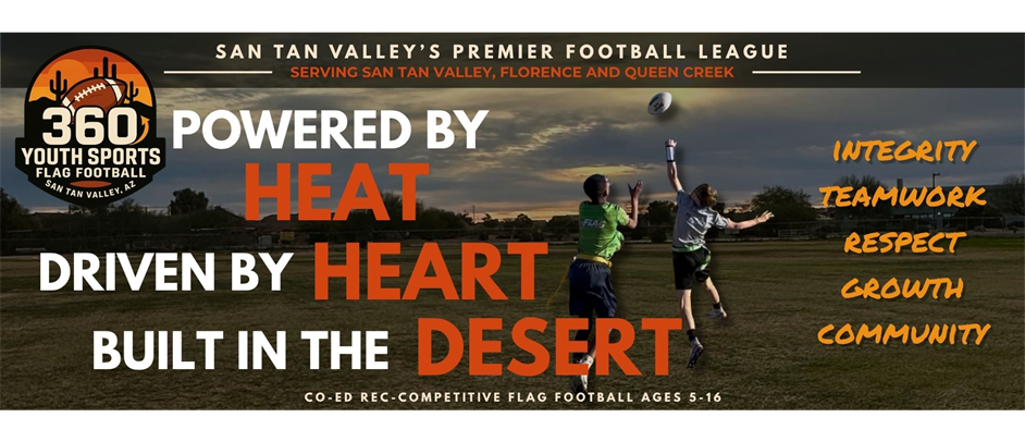Welcome to 360 Youth Sports Flag Football - San Tan Valley, AZ 🌵Where Arizona grit meets game-time greatness. We’re more than a league, we’re a community built on hustle, heart, and heat.At 360 Youth Football, our mission is to shape strong athletes in the heart of the desert, where the sun’s intensity builds character and hard work creates greatness. We empower young players through fearless competition, relentless teamwork, and a foundation built on integrity and respect. This is more than a game it is a relentless movement that fuels unstoppable growth and builds an unbreakable bond in the San Tan Valley community with every snap.We are a competitive recreation league - bridging the gap between traditional recreational play and elite travel ball. Our format gives players the best of both worlds: the structure and inclusivity of a rec league combined with the high-energy, disciplined, and fast-paced environment of competitive football. Here, athletes earn their spots through effort, attitude, and execution, learning that success is built through commitment and accountability both on and off the field.INTEGRITYTEAMWORKRESPECTGROWTHCOMMUNITYThe vision of 360 Youth Sports is to become San Tan Valley’s most dynamic youth football program where every player rises through the fire with confidence, purpose, and pride. We envision a future where 360 Youth Football is the standard for character driven competition, desert tough resilience, and unstoppable community spirit.